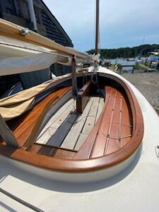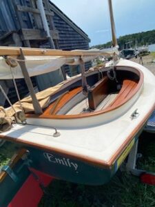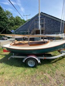 This 1998 Arey's 14' Cat has been well maintained and stored insides. Emily is ready to sail and includes a 2018 electric Torqeedo motor, paddle, rudder, mainsail, cockpit cover, tiller, wind pennant, anchor, pump spars and rigging. Recent work and new items include bottom painted Vivid Red, new rudder step installed, removed centerboard trunk veneer and gelcoat the fiberglass.